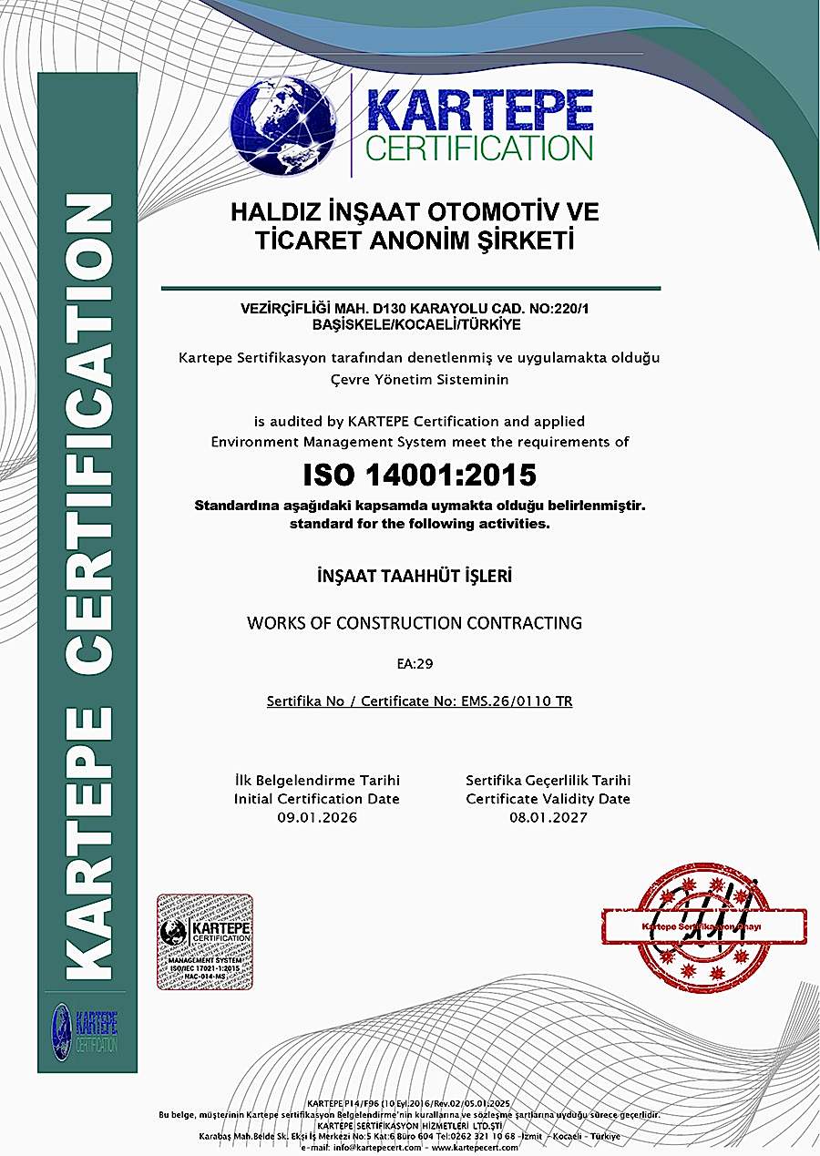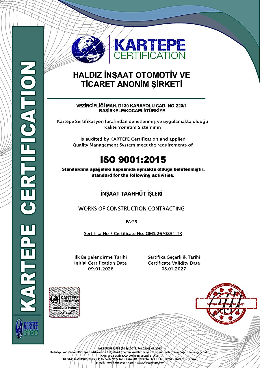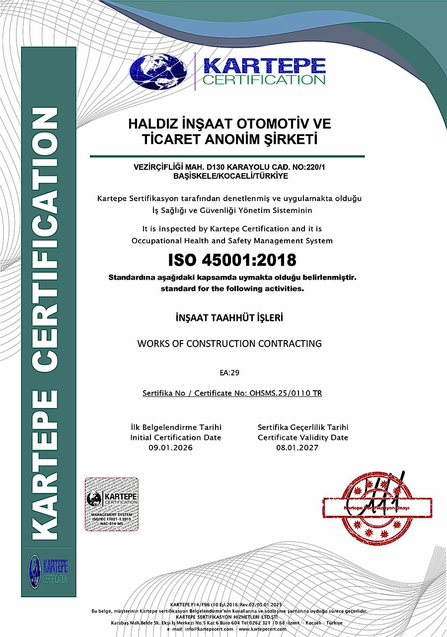 As a result of TRB audits, Haldız Construction was awarded the certificates of ISO9001 Quality Management Systems, ISO14001 Environmental Management Systems, ISO45001 Occupational Health and Safety Management Systems.